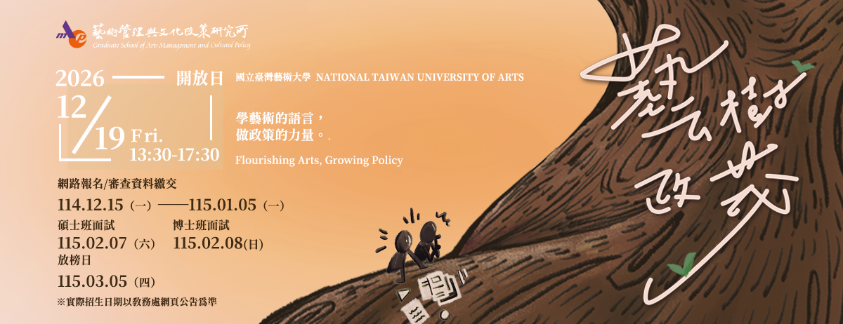 國立臺灣藝術大學藝術管理與文化政策研究所,自2006年成立至今已逾19年,以「藝術管理」與「文化政策」為經緯,除了扎實的學理基礎以外,也藉由藝文論壇、大師講座等活動與業界實務接軌,