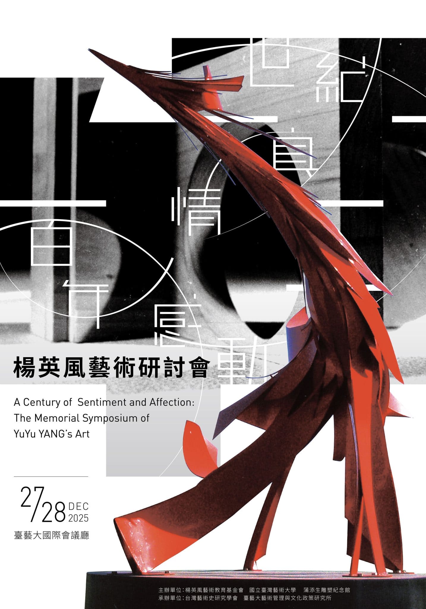 主視覺海報,以楊英風完美融合東方典雅曲線和西方金屬雕塑的代表作「鳳凰來儀」為主角,熱情躍動的朱紅色設計映襯著灰階幾何背景中莊重沉穩的「百年」二字,在感性與理性的張力中,傳達出本次研討會「世紀真情、百年感動」的主題精神,既是對藝術家的致敬,也是學術與美學交會的視覺詮釋。
