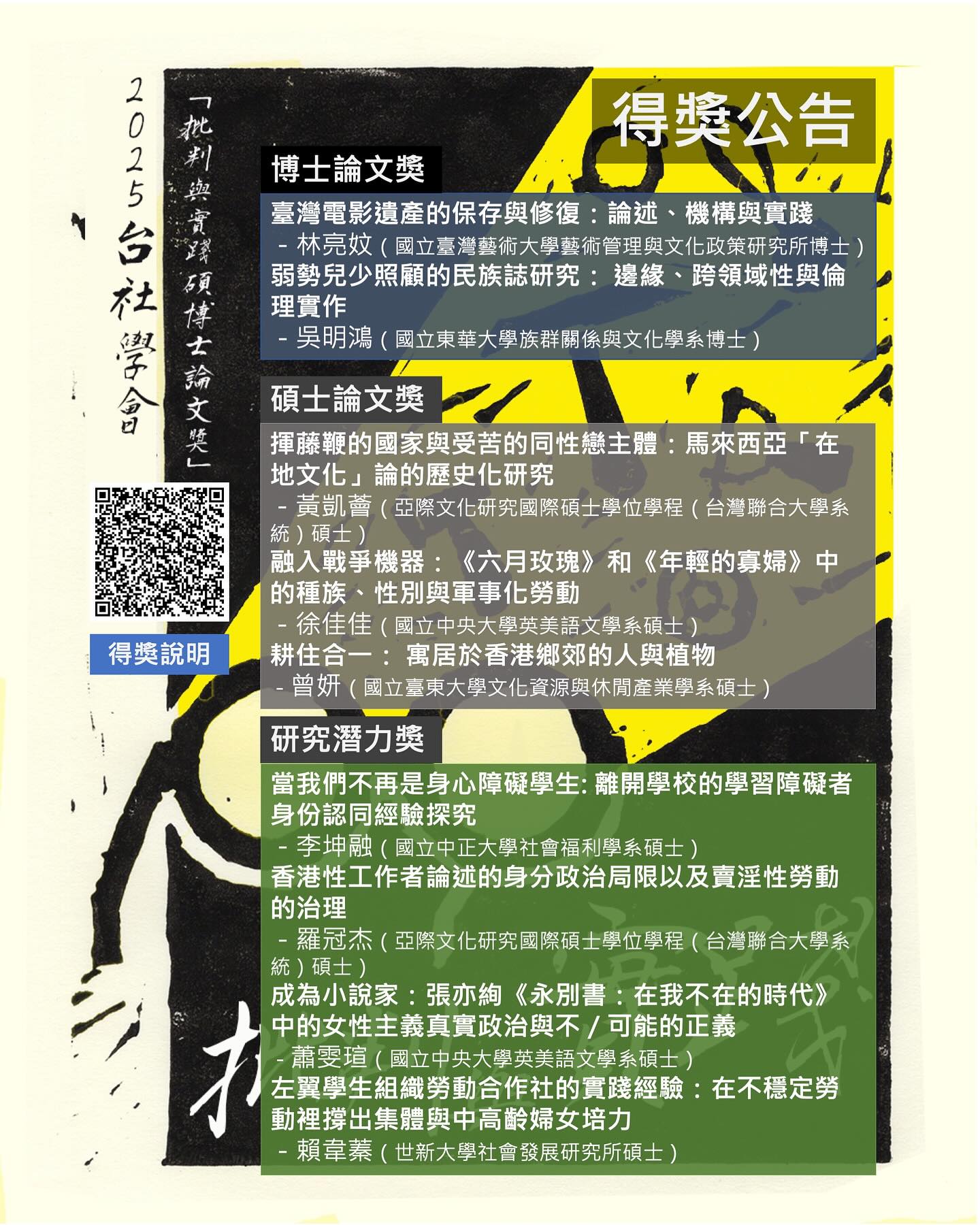 恭喜本所博士生林亮妏「臺灣電影遺產的保存與修復:論述、機構與實踐」榮獲2025台灣社會學會博士論文獎