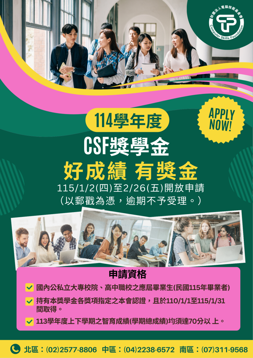 | 9 | 財團法人中華民國電腦技能基金會獎學金 | 自行送件 | 115年1月2日至115年2月26日止 |