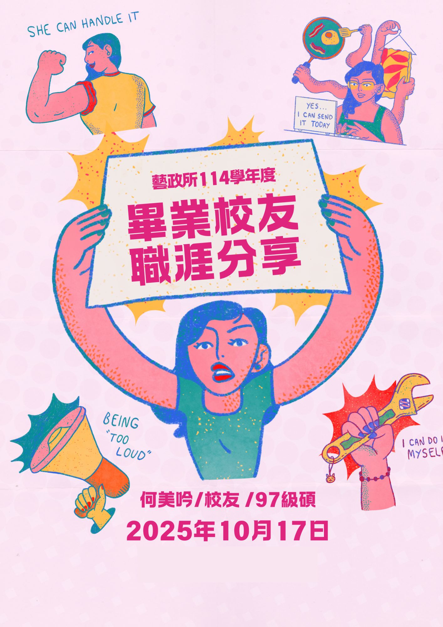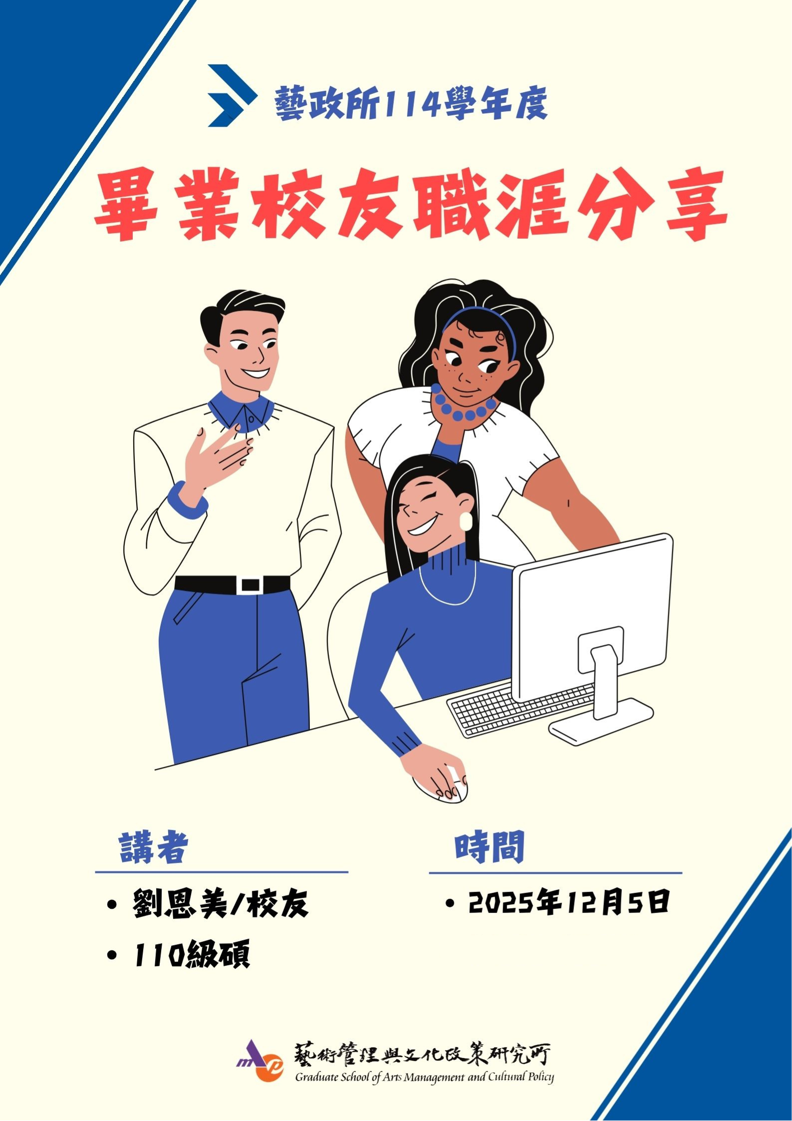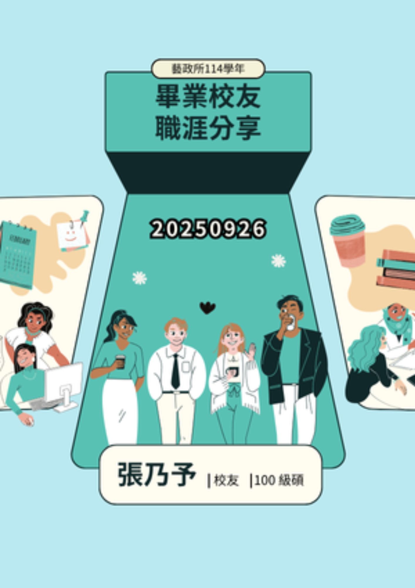 內容:何校友曾任職於國藝會獎助、研發組,現為南山人壽業務主任,以藝政所畢業生的身分分享跨域職涯經驗。她首先介紹國藝會的經費來源與公部門體制的穩定性,說明在文化行政體系中累積的溝通與組織能力,如何成為轉職企業界的重要基礎。她也鼓勵學弟妹回想當初報考藝政所的初衷,從熱情與使命出發重新規劃人生方向。最後以保險業精神指標MDRT全人理念作結,強調個人需在家庭、健康、教育、財務、精神與服務之間找到平衡,並指出即使是夜間進修或兼職工作,也能透過自我管理與熱忱實踐「全人」精神,實現職涯多元發展與社會貢獻。 |